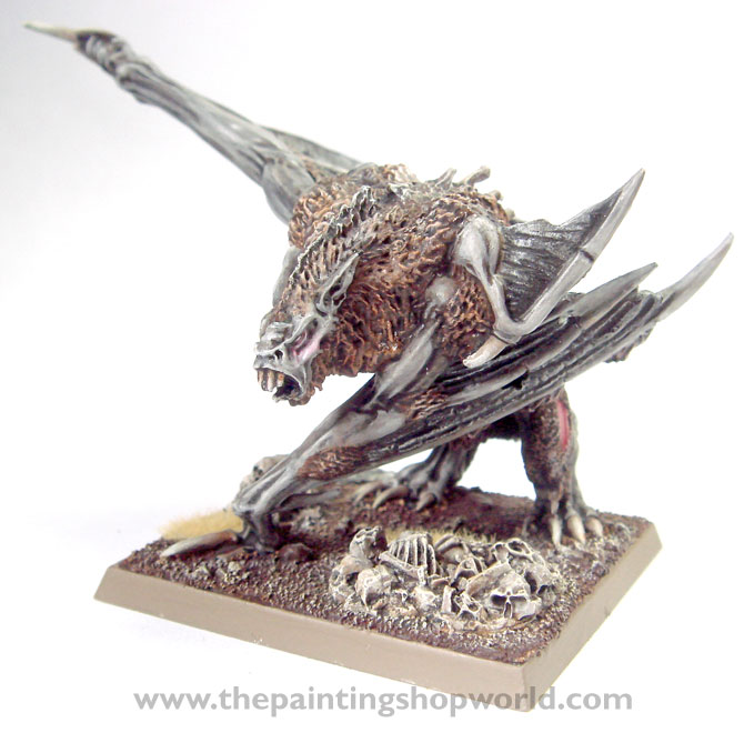 Managed to get my Vampire Count Varghulf completed. Chosen an ash grey sort of skin texture colour, along with the beastial brown for the fur coat areas. Colour scheme more like the box painted Varghulf. The wings I decided to just stick it to black with white dry brush, same style like I did with my bats.
