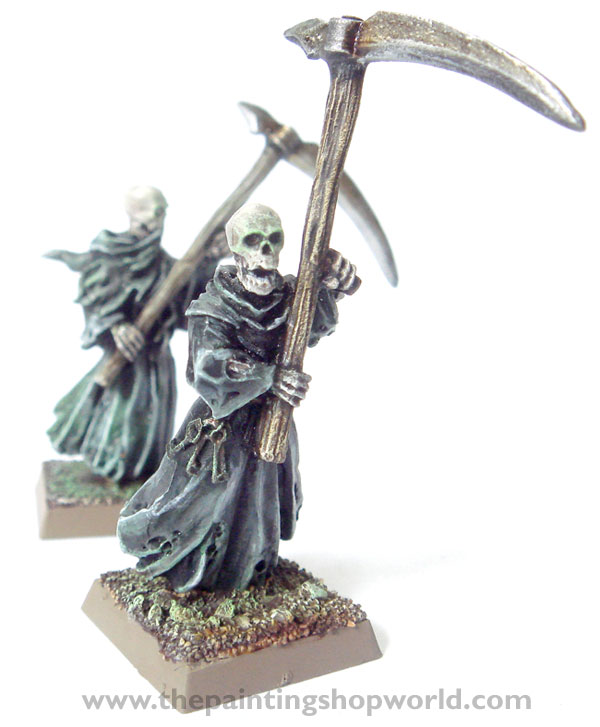 Painted the Cairn Wraith with shades of Citadel Chaos Black and Fortress Grey, highlighted the edges with Skull White. After which a diluted wash of Citadel Dark Angel Green is wash over the miniatures. Once dried, the edges are highlighted with Citadel Skull white lightly.