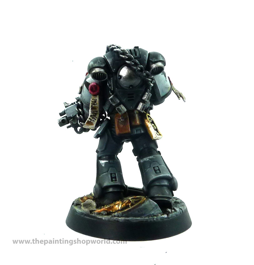 Black is a simple colour scheme, but it is challenging to paint. Started with based black and black, and the highlights were build with layers of airbrushing of shades of different greys. The shoulder pad symbols, I managed to cut them up and join together from a pile of Games Workshop decals, to form the Black Templar symbol.