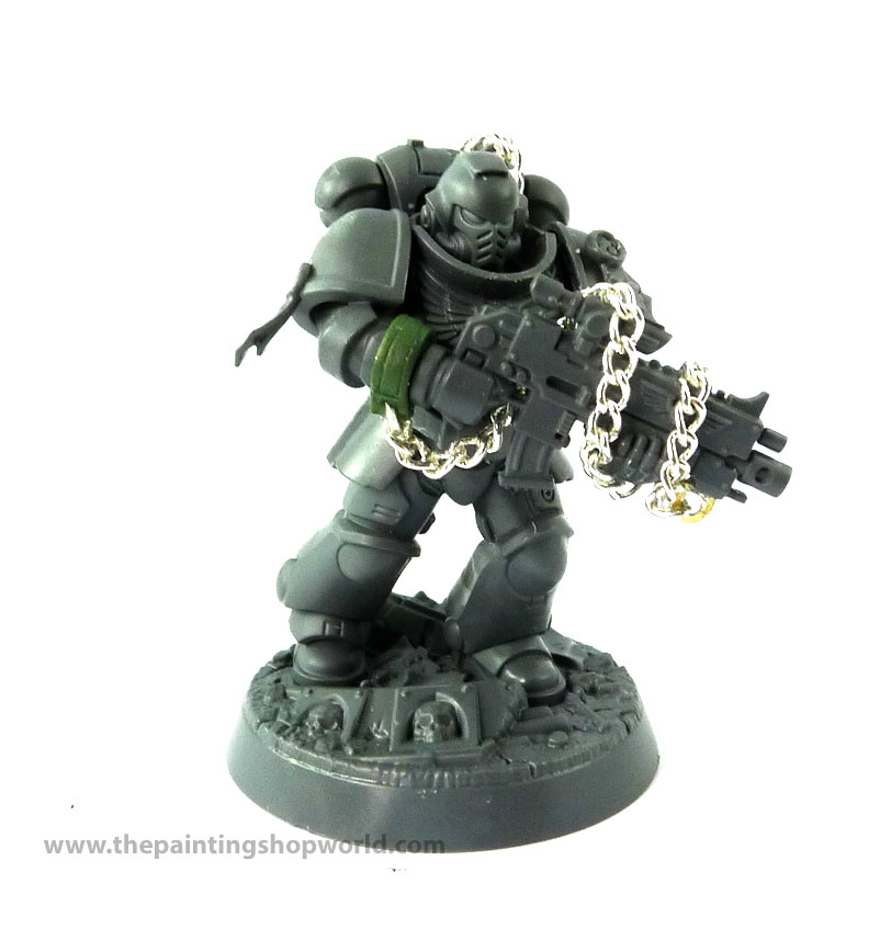 I have always like the idea of the Black Templars having their arms chained to their bolters. So, I decided to add a chain to the bolter and the wrist following some of the illustrations of Black Templars on the internet.